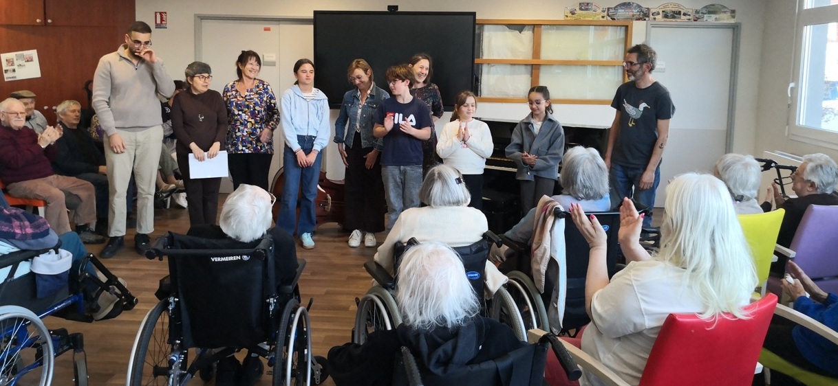 Merci aux élèves : Asna, Corinne, Elsa, Clément, Juliette, Elisabeth, Mireille, Gwenola et Narek ainsi qu’à tous ceux qui les ont accompagnés pour cette représentation musicale tant attendue par les Aînés.