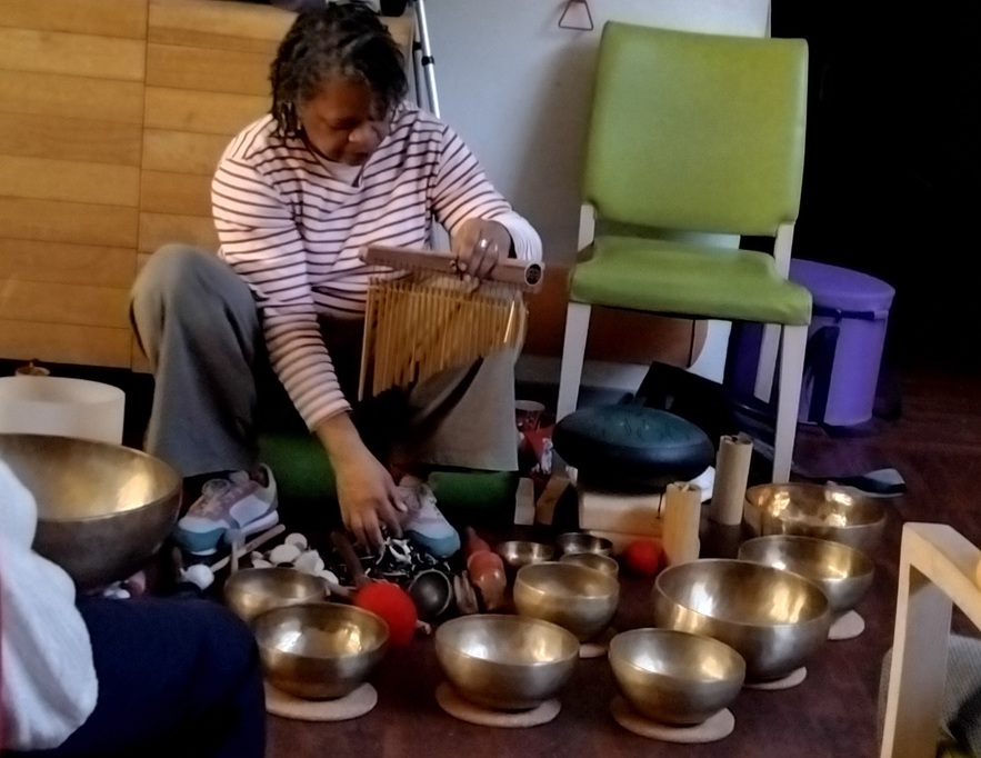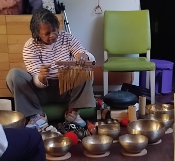 Lumière tamisée, la séance commence par un moment de prise de conscience de son corps. Puis les instruments résonnent : carillons, bols, bâton de pluie, handpan.